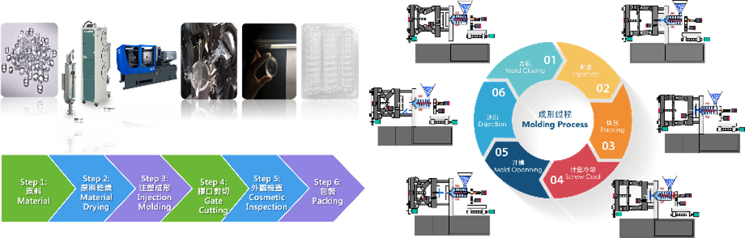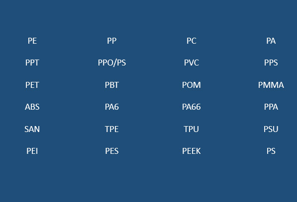 ABS, PP, PC, PA, PE, PPO/PS, PPA, ABS, PET, PBT, POM, PMMA, PA6+GF,PPT, PPS, PVC, SAN, TPE, TPU, PSU, PEI, PES, PEEK, etc.